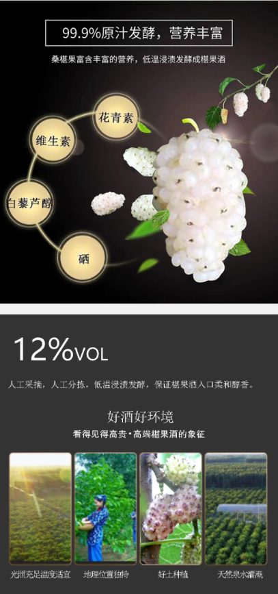 桑椹酒含有十八种人体所需的氨基酸和多种微量元素,其中桑甚含硒量是葡萄的12.41倍硒被科学家称之为人体微量元素中的“抗癌之王”;花青素含量是葡萄的5倍;白藜芦醇的含量是葡萄的10.19倍。