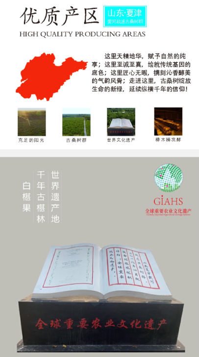 山东椹树下生物科技有限公司成立于2017年4月,是一家依托全球重要农业文化遗产地--山东夏津黄河故道桑树资源,集桑树培育和示范种植、桑椹和桑叶等深加工、椹果酒、椹叶茶等系列产品销售等为一体的创新技术型企业。夏津黄河故道桑树资源历经数次变迁,公元11年黄河改道后,沙丘连绵,不宜稼禾历史上劳动人民为防风固沙,广植桑树,桑树生命力极其旺盛,根系发达,逐渐形成了数万亩的古桑树群,“攀援20里如履平地”。桑椹果被卫生部列为“既是食品又是药品”第一植物名单。山东椹树下生物科技有限公司拥有完整科学质量管理体系及研发团队,以品质赢市场,以诚信实力和产品质量获得业界认可。