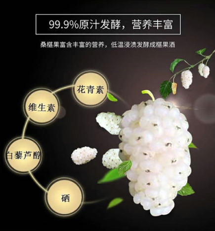 桑椹源于大自然,原料来自世界遗产地千年古桑树的白玉王酿制而成,人工采摘,人工分拣,低温浸泡发酵,保证椹果酒入口柔和醇香。又因其制作工艺的独特性,入口圆润、甘甜、有一股沁人心脾的椹香,口感甘甜醇厚,清新可口,回味悠长是重视健康之人士的绿色食品首选。棋果酒的最佳饮用温度8~12度,宜可搭配冰块,苏打水一起饮用,享受不一样的口感,满足您的味蕾。