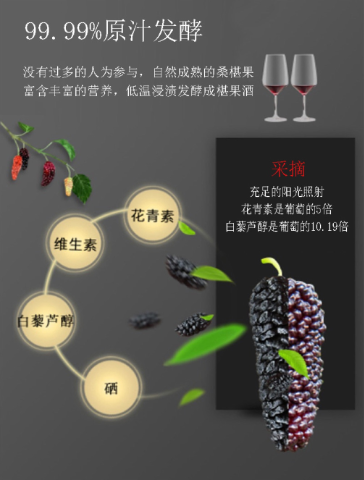 桑椹源于大自然,原料来自世界遗产地千年古桑树的鲜果酿制而成,人工采摘,人工分拣,低温浸泡发酵,保证椹果酒入口柔和醇香。又因其制作工艺的独特性,入口圆润、甘甜、有一股沁人心脾的椹香,口感甘甜醇厚,清新可口,回味悠长是重视健康之人士的绿色食品首选。椹果酒的最佳饮用温度8~12度,宜可搭配冰块,苏打水一起饮用,享受不一样的口感,满足您的味蕾。