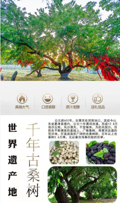 山东椹树下生物科技有限公司成立于2017年4月,是一家依托全球重要农业文化遗产地--山东夏津黄河故道桑树资源,集桑树培育和示范种植、桑椹和桑叶等深加工、椹果酒、椹叶茶等系列产品销售等为一体的创新技术型企业。夏津黄河故道桑树资源历经数次变迁,公元11年黄河改道后,沙丘连绵,不宜稼禾历史上劳动人民为防风固沙,广植桑树,桑树生命力极其旺盛,根系发达,逐渐形成了数万亩的古桑树群,“攀援20里如履平地”。桑椹果被卫生部列为“既是食品又是药品”第一植物名单。山东椹树下生物科技有限公司拥有完整科学质量管理体系及研发团队,以品质赢市场,以诚信实力和产品质量获得业界认可。
