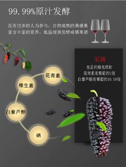 桑椹源于大自然,原料来自世界遗产地千年古桑树的鲜果酿制而成,人工采摘,人工分拣,低温浸泡发酵,保证椹果酒入口柔和醇香。又因其制作工艺的独特性,入口圆润、甘甜、有一股沁人心脾的椹香,口感甘甜醇厚,清新可口,回味悠长是重视健康之人士的绿色食品首选。椹果酒的最佳饮用温度8~12度,宜可搭配冰块,苏打水一起饮用,享受不一样的口感,满足您的味蕾。