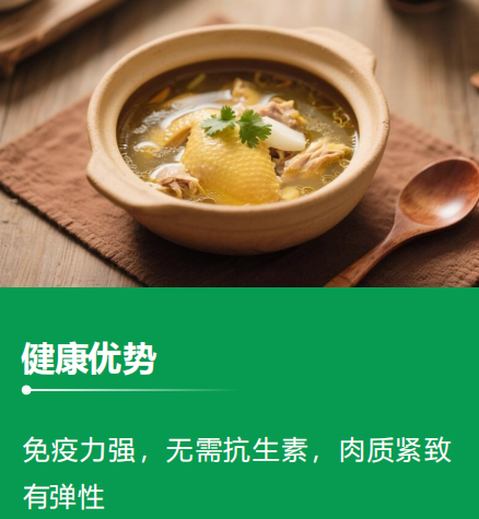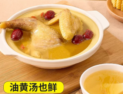 肉质特征——210-240天的老母鸡正处于产蛋高峰期;因具有肉质韧性适中,腿肌健壮,营养成分积淀等特点,特别适合煲汤——肉汤透明澄清、不糊,可见锅底,脂肪呈独粒珠浮游在汤面;脂珠不粘锅边,肉有韧度,鸡汤香味浓郁。