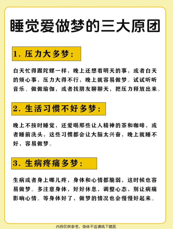 如果只是偶尔多梦,但白天精神状态良好,通常不会对健康产生影响。然而,如果睡眠中出现多梦、噩梦、频繁觉醒,还伴有入睡困难等睡眠障碍,那就需要引起重视了,建议及时咨询专业医生。
