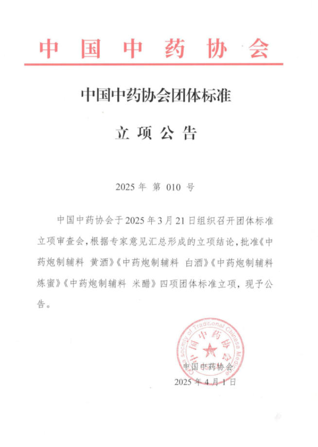 中国中药协会团体标准立项公告(2025年 第010号)
