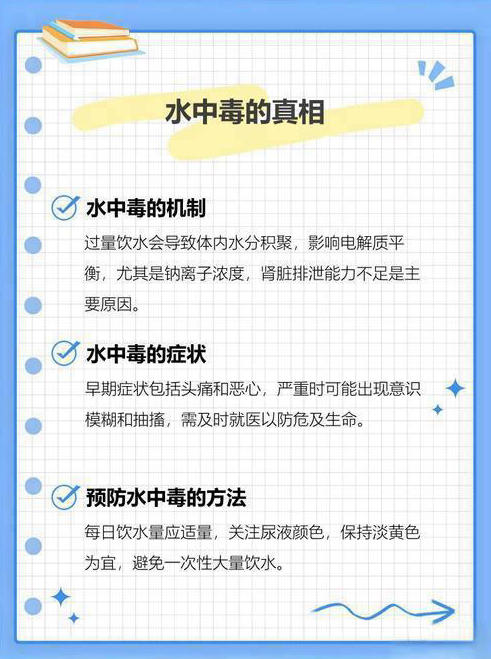 任何事情都应适度,喝水也是如此。我们提倡多喝水,但并非无节制地饮水。补充水分不宜过多、过快,若超过肾脏排泄速率,会引发水中毒症状,包括细胞水肿、血钠浓度过低、颅内压升高、肺水肿、肾脏损害、肌肉损害,甚至有生命危险。