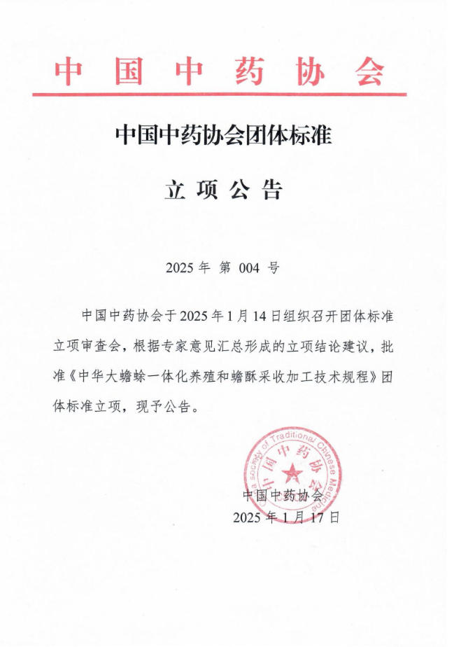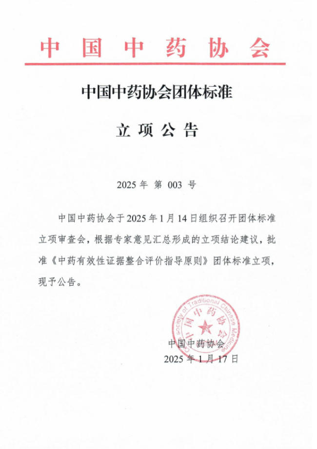 中国中药协会发布两项团体标准立项公告(2025年 第003号和第004号)