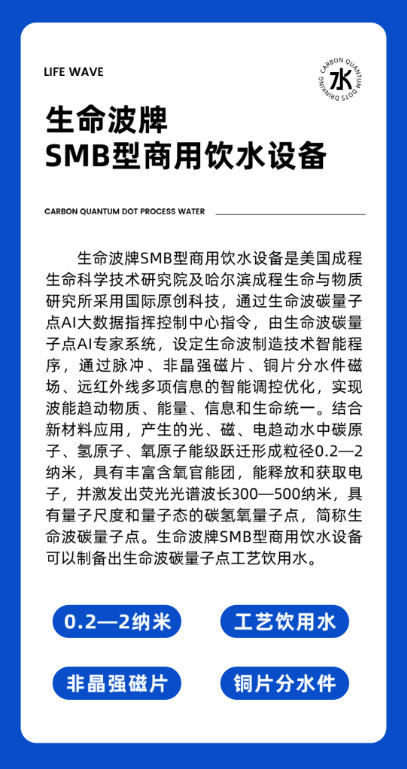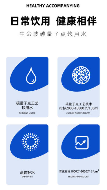 生命波碳量子点水是依据量子生物学,生命物质“碳点”抗癌抗病毒抗衰老科研成果。根据“一种具有抗癌生物活性的碳点及制备方法”发明专利原理,成程科技采用以光磁电趋动物质能量信息生命统一的生命波技术以及AI制造技术,研发出生命波牌SMB-0,5T型/2T型/5T型制水设备,并制造出不同工艺指标的碳量子点工艺水,将水中碳原子、氢原子、氧原子及微量元素能级跃迁合成具有量子尺寸和量子态的液态“碳点”,又称碳量子点。制成水中“碳点”粒度小于1000纳米,碳量子点占比10%6-90%的碳量子点饮用水。