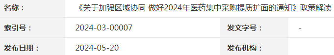 日期:2024-05-20 来源:国家医疗保障局为深入贯彻党中央关于药品耗材集中带量采购的部署,落实2024年《政府工作报告》“完善国家药品集中采购制度”要求,国家医保局近日印发《国家医疗保障局办公室关于加强区域协同 做好2024年医药集中采购提质扩面的通知》(以下简称《通知》)。《通知》提出继续大力推进医药集中带量采购工作,加强区域协同,提升联盟采购规模和规范性,明确行业预期,持续巩固改革成果。《通知》主要包括四部分内容。