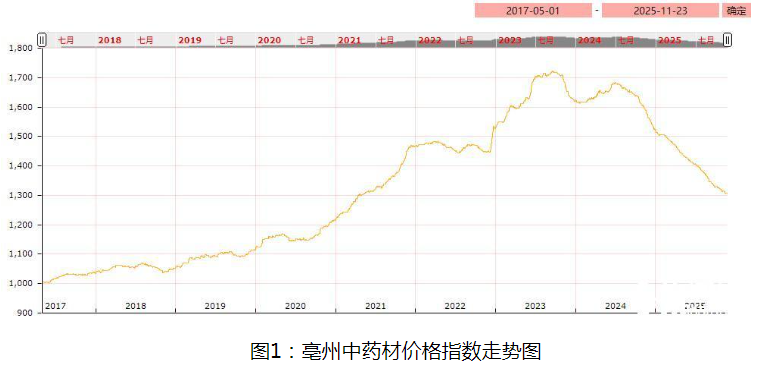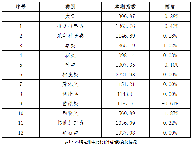 据对亳州中药材价格监测显示,2025年11月份第三期亳州中药材价格大盘指数为1306.87点,与上期1310.5相比,下跌3.63点,跌幅0.28%。结合12类分类指数呈现“4涨4跌4持平”的态势。其中果实种子类1146.89点,上涨0.18%;草类1365.19点,上涨1.02%;花类1098.14点,上涨0.03%;其他加工类1036.09点,上涨0.32%;根及根茎类1362.76点,下跌0.43%;叶类1007.35点,下跌0.1%;菌藻类1187.7点,下跌0.61%;动物类1560.89点,下跌1.87%。