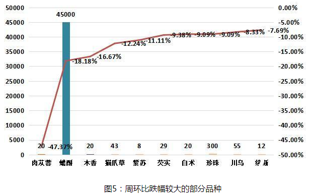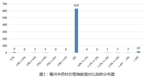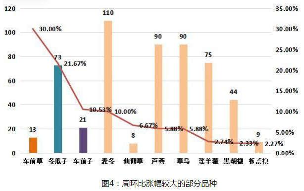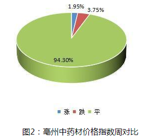本期大盘品种涨跌环比分析显示,涨价品规占比1.95%;跌价品规占比3.75%;平价品规占比94.3%。近期药市货源走销依然不乐观,随着大量新货干品上市,行情波动品种也随之增加,目前参与各方仍持观望态度,低迷行情继续运行中。
