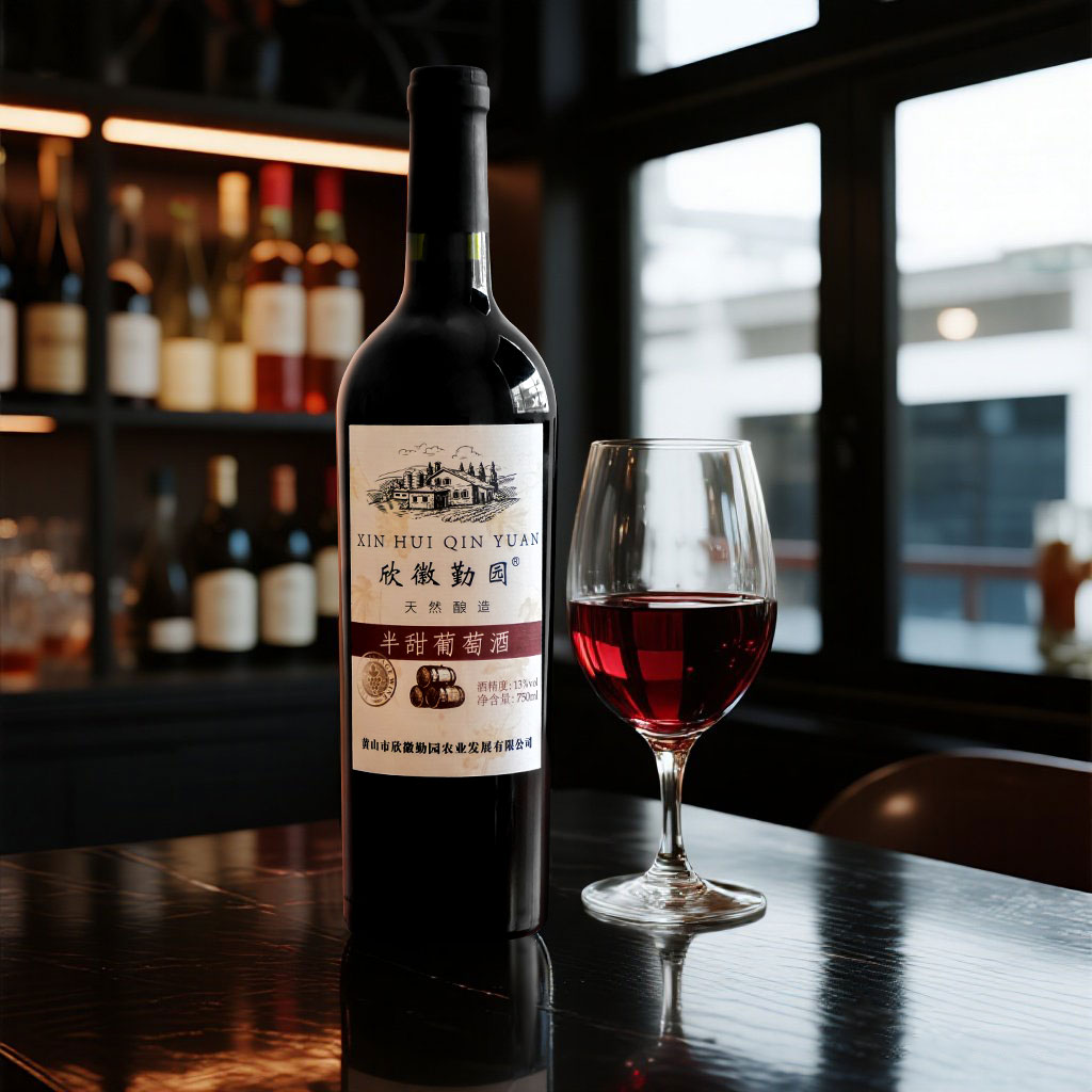 欣徽勤园葡萄酒采用两种酿酒葡萄和两种鲜食葡萄混合酿造,酿酒酵母菌源自农场天然酵母菌,发酵过程中无任何添加剂,充分保留了葡萄的天然风味。酒体色泽深红,果香浓郁,口感饱满圆润,回味绵长,尽显顺滑与果香的完美契合。