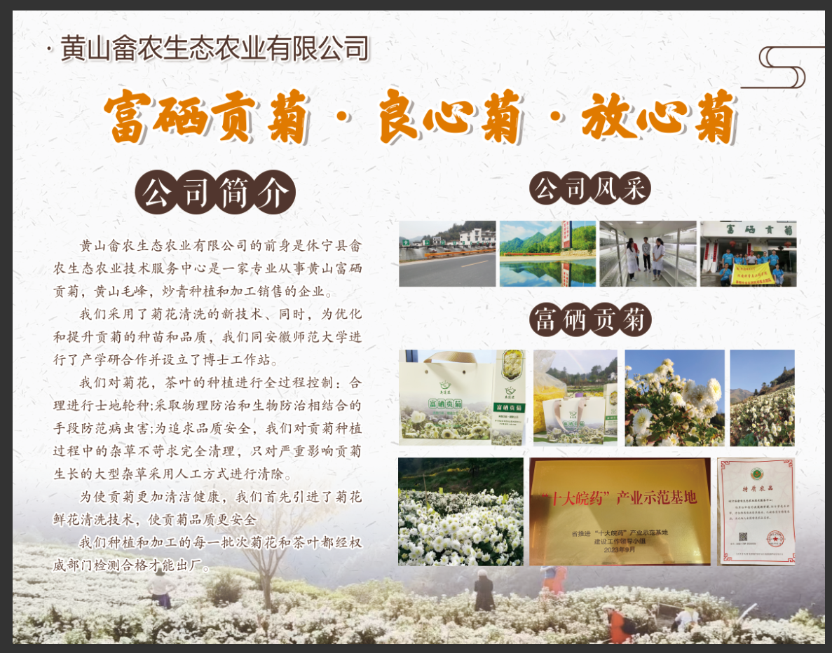 黄山畲农生态农业有限公司是一家集科研、育种、种植、加工、销售于一体的黄山贡菊全产业链现代化农业企业。公司以“富硒贡菊、良心菊、放心菊”为核心理念,致力于为消费者提供天然、健康、优质的富硒菊花产品。